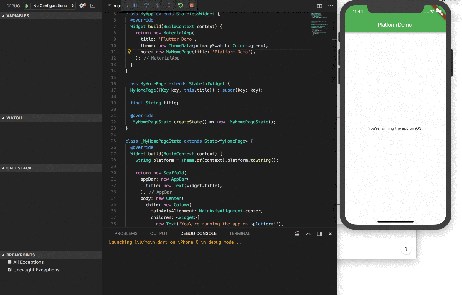 The above code example is running on an iPhone X simulator as well as an Android emulator running Android P. As you can see, Flutter has resources to determine which platform you are targeting if you wanted to differentiate your app per platform. Flutter even offers a second set of widgets named “Cupertino” which will give the app that iOS-feel.
