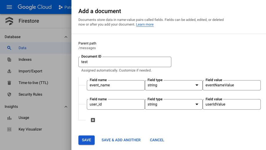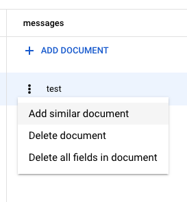 In GCP, go to Firestore, click the three-dot menu next to the test document in the messages collection and choose Add similar document.